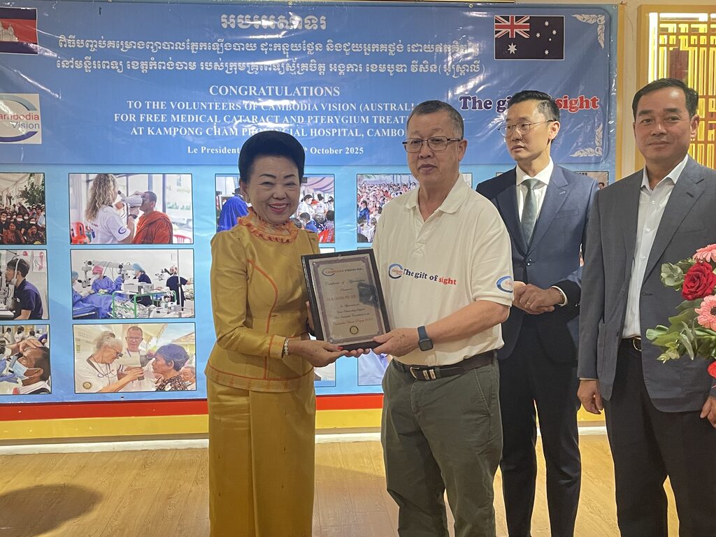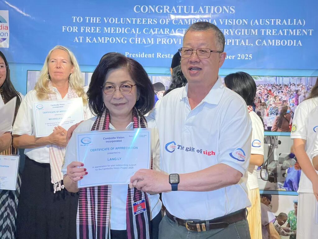 【本報悉尼訊】於上月底一連六天工作日,在柬埔寨距離首都金邊逾百公里之磅湛省展開行動的「2025 柬埔寨光明之行」治療白內障、聽障及其他輕微病況義醫義診慈善活動經已順利完成,百多位由醫護人員、義工及後勤團隊,包括來自悉尼、墨爾本之澳洲團隊為主力,其他布里斯本、西澳、達爾文及英國、法國、星馬、台灣地區的義務醫療團隊,當中還有中國廣東江門新會愛爾新希望眼科醫院醫護團隊及來自台灣等的眼科醫護人員、聽力師、本科中、西醫及醫護助理,贊助商和義工們聯合組成之愛心義務團隊,齊爲有近6000名柬埔寨全國各地的貧困患者前往求診,當有597人接受了治療白內障手術,得以重見光明。