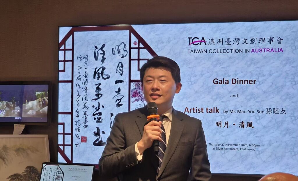 澳洲台灣文創理事會會長林挺瑞首先致詞感謝出席嘉賓的支持,並說明理事會宗旨,主要為推廣文化及藝術。理事會未來將繼續舉辦藝術講座及文化藝術活動,並積極促進台澳兩國之間文化交流。駐雪梨台北經濟文化辦事處吳正偉處長致詞表示,很高興參與澳洲台灣文創理事會週年慶晚宴。 台灣文化獨具特色,根植於深厚的歷史底蘊,充滿活力與創新。無論是傳統工藝、當代設計、原住民文化、表演藝術或美食,各項元素都展現出開放、充滿活力和創造力的台灣,澳洲台灣文創理事會的活動呈現了這幅美麗的文化拼圖。本次活動不僅是一個里程碑,更代表使命、奉獻與影響力的讚頌,活動的成功,不僅需要主辦單位的規劃、藝術家的創意,更需要台灣社群的支持,因為文化交流不只是展示,更代表相互連結、理解和友誼。展望未來,期望澳洲台灣文創理事會繼續發展壯大,成為連結兩國的橋樑。Willoughby威樂比市 副市長Angelo Rozos致詞盛讚本地台僑除事業有成之外,也積極熱心公益,在Willoughby市的各項活動中,都欣見許多熟悉的面孔。本次展覽的畫作,豐富多彩,細緻精美。期盼未來台僑社團透過文化與藝術,更加強社區的多元文化層面。Anna Greco市議員致詞時表示,澳洲台灣文創理事會的藝術展,猶如一座意義非凡的橋樑,時刻提醒著我們文化藝術如何以靜謐而強大的方式豐富著我們的社區,將台灣的創意、文化遺產和認同帶入我們公共空間的中心。它邀請每一位參觀者,無論背景如何,駐足沉思,探索那些跨越時空的故事。本次展覽展出的是孫睦友的作品。他的生平講述了一個關於奉獻、堅韌和畢生與藝術相伴的故事。從早期的藝術訓練,到傑出的航海生涯,再到在雪梨安家落戶,他的人生歷程為我們眼前的風景畫、花卉畫和書法作品增添了豐富的內涵。他的作品訴說著一種溫柔而普世的語言。雖然是無聲,它們也能喚起我們共同的情感 — 寧靜、思念、回憶以及大自然帶來的靜謐喜悅。但超越藝術,本次展覽提醒我們一些更偉大的東西,藝術的創造具有共享體驗的能量,展現我們對於創造力、想像力及表達自我的渴望,這是所有文化共通的,這些作品將我們聯繫在一起,彼此理解。藝術是我們擁有的最強大的連結紐帶之一。文化藝術培養同理心,邀請我們聆聽自身以外的故事,並鼓勵我們讚美並促進我們社區的多元文化,激勵我們超越國界,尊重文化遺產,並珍惜藝術這種通用語言。願這個文藝展覽凝聚我們社區,學習和欣賞能夠引起我們所有人共鳴的藝術。Michelle Chuang莊明雪市議員在致詞時表示,澳洲台灣文創理事會真正特別之處在於其宗旨:推廣和提升對台灣藝術卓越成就的認識。在以多元文化和活力而聞名的本市,更是適合這樣精美的文藝展覽,豐富我們本地的多元藝術文化層面。感謝澳洲台灣文創理事會的努力,期許未來有更多的文化交流,透過豐富多樣的藝術品及工藝品,促進台澳兩地藝術文化的交流。主辦單位此次特別邀請孫睦友先生發表藝術講座。孫先生現年八十五歲。1969年畢業於國立臺灣海洋大學航海系。曾於臺灣各航運公司服務,任職船長。1985年偕家人自臺灣移居澳洲雪梨。孫先生幼時曾受名師指導,研習繪畫。成年後在工作閒暇時,潛心學習書法。退休之後,除揮桿於高爾夫球場以健身,其餘時間更勤於揮毫寫字,或潑墨作畫,皆以自娛,亦以充實生活之內涵。本次作品主題為「明月・清風」,源於被譽為「近代書聖」於右任先生之草書對聯「明月一壺酒,清風萬卷書」,詩句具有放懷天地之襟懷,並高邁豁達之心境,乃其心嚮往之。平日喜蒔花種草,作品描摹花樹之美,不在繁華,而在靜意。花開疏密,春風拂過,花影搖曳,似低語,似沉思,皆為心靈之棲所,歲月之靜處。因喜愛自然淡泊之居家生活,嚮往田園風光,自然景象。山水畫作,意境幽遠,水畔石隙,蝦蟹遊走,筆觸靈動,寫其神態,亦寫其自在。山光水色中,書者臨風而坐,觀雲卷雲舒,聽溪聲潺潺,心無塵累,筆無拘束,藉筆墨之間,尋與天地對話的純粹與寧靜。晚會最後,由澳洲台灣文創理事會執行長黃教庭主持摸彩活動,獎品豐富,賓主盡歡,晚宴圓滿結束。