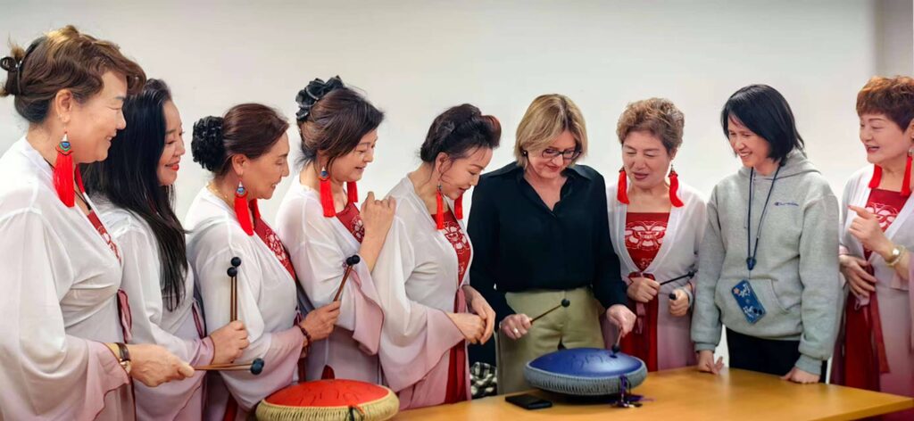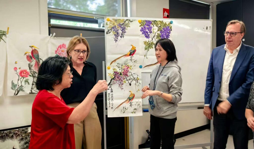 活動伊始,艾倫州長在維州議員Matt Fregon陪同下,與在場長者會員們親切握手表示問候,聽取東區華人俱樂部施戈會長的活動情況介紹,氣氛溫馨融洽。艾倫州長發表熱情洋溢的講話。她表示,維州的繁榮離不開每一位居民的貢獻,尤其是可敬的長者們。你們是維州多元文化社會的基石,你們的故事、智慧和技藝,共同塑造了我們今天這個充滿活力的社區。艾倫州長回顧了維州與中國的悠久友誼,從170年前淘金時期在大金山並肩勞作,共同分享語言與技藝,到如今在經貿、教育、文化等領域深度合作,共建出今天多元文化的現代社會。她強調,維州政府始終致力於為所有居民,包括老年人,創造一個安全、健康、有尊嚴的生活環境。並將繼續支持社區中心的發展,確保長者們能夠獲得所需的社交、健康和文化服務。活動現場,艾倫州長被旗袍組的展示所吸引。數位身著粉色旗袍的女士們,正優雅地進行著走秀排練。一件件旗袍,彷彿陳述著關於東方女性美的故事。州長饒有興致地拿起真絲旗袍認真欣賞,與旗袍組成員親切交談,瞭解旗袍背後的文化符號,表示這種傳統服飾是連接過去與現在的文化橋樑。隨後,艾倫州長移步至社區活動中心另一側,國畫組的雅集正在進行。長桌上宣紙筆墨顏料一應俱全,國畫組成員們執筆創作習作。州長看著牆上懸掛的山水花鳥中國水墨畫作品展覽,從工筆重彩的傳統遺韻,到潑墨寫意的現代創新,仔細欣賞,讚歎不已。東方的水墨傳達出深遠的意境和哲學,與西方追求光影與結構的繪畫手法相得益彰。活動的精彩時刻,是艾倫州長親身體驗華夏傳統樂器空靈鼓。她跟隨指導老師的示範,用鼓槌輕柔地敲擊鼓面的音舌,演奏出Happy Birthday大家熟悉的曲調。空靈鼓音色空曠純淨,深沉醇厚,有古典樂器的婉轉靈秀,也有現代樂器的穿透魅力。州長的即興演奏搏得大家熱烈的掌聲。艾倫州長的親民舉動,贏得在場華人長者們一致好評。州長的來訪,讓華人社區感受到尊重與溫暖,看到政府對多元文化的支持和承諾。促進社區與政府之間的良性互動,增強不同族群之間的相互理解和信任,減少誤解和偏見,促進多元文化社會和諧。東區華人俱樂部會員等上百人參加重陽節應節活動,盡歡盡興,收穫滿滿,度過愉快的一天。