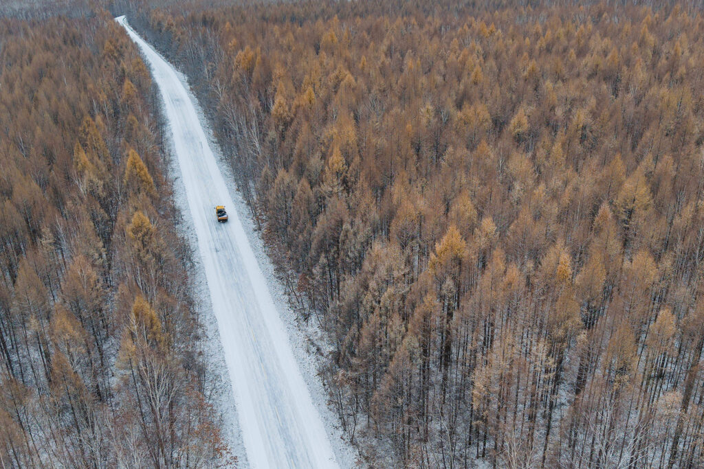車輛在G331國道嘉蔭段的林海雪原間行駛(無人機照片)。新華社