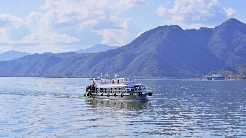 遊客在G331遼寧丹東段沿線的寬甸河口景區乘坐遊船遊覽鴨綠江。