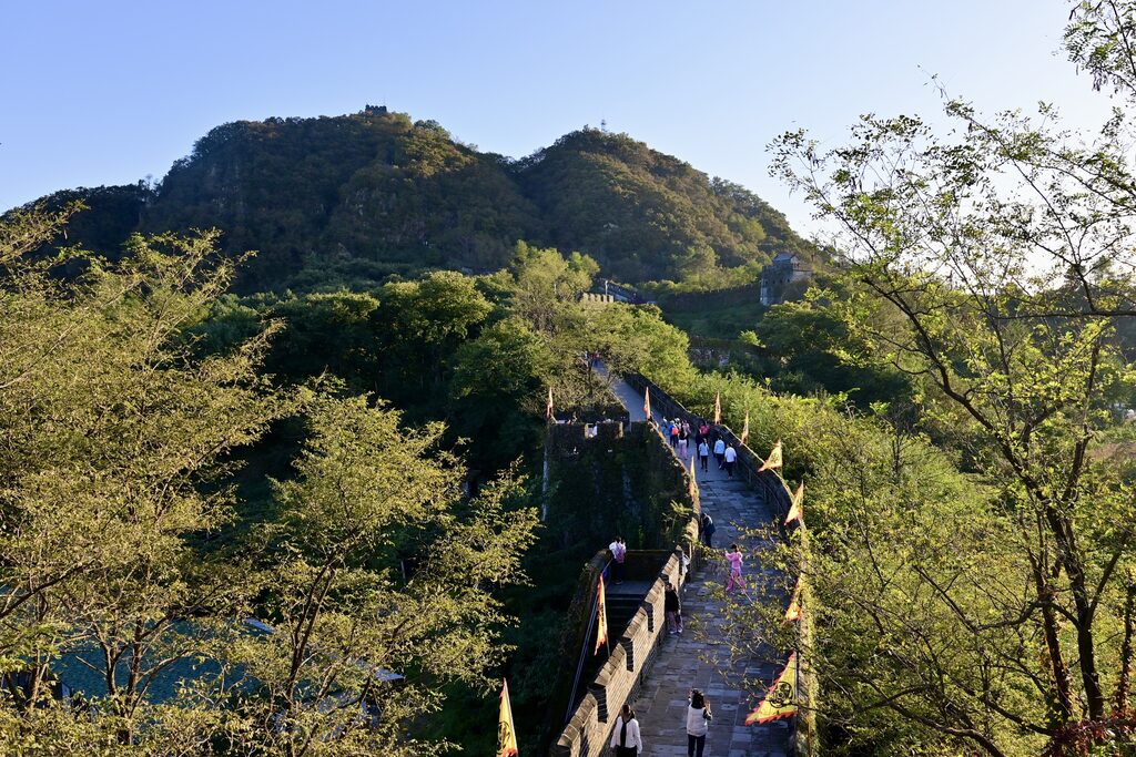遊客在G331遼寧丹東段沿線的虎山長城景區遊覽。
