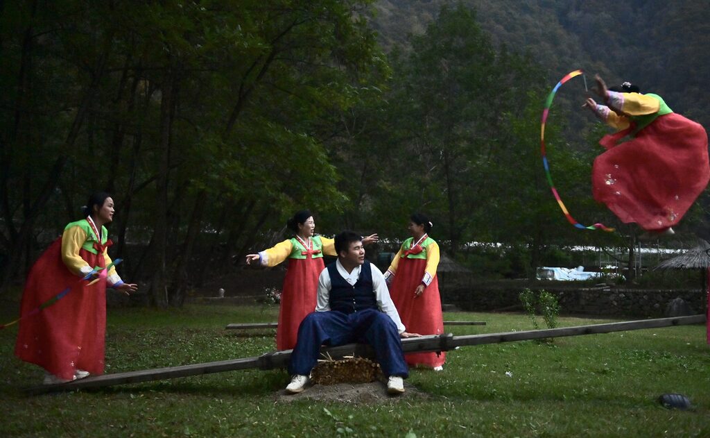 朝鮮族村民在遼寧省丹東市的三道河朝鮮族民俗村為遊客表演跳蹺蹺板。新華社