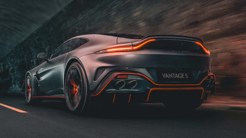 Vantage S以「Aggressive Elegance」為設計主軸,車頭蜂巢護罩加大並內嵌紅色飾條,引擎蓋新增導流鰭片不僅強化散熱,更增添視覺張力。LED頭燈組採用燻黑內殼與紅色底座,側進氣壩加大營造不怒自威氣勢。車側無框車門與加厚側裙,21英寸Y字型消光黑鍛造輪圈(紅色視覺套件)搭配紅色M卡鉬,輪胎規格前255/40 R21、後295/35 R21,視覺與抓地兼顧。車尾M字形尾翼提供44公斤下壓力,全車總111公斤,底盤擾流板貢獻67公斤。專屬「S」黃銅徽飾由Vaughtons珠寶工藝打造,紅色琺瑯填色與鍍鉻外框,點綴車側與尾門。內裝標配Accelerate極速套件,Alcantara麂皮+真皮座椅採用紅色縫線與「S」頭枕刺繡。碳纖維飾板與紅色M安全帶,M多功能方向盤紅色12點鐘標記與換檔撥片。10.25英寸儀錶+11.4英寸中控支援Apple CarPlay/Android Auto,頂規B&O Beosonic音響(15揚聲器)聲場細膩。選配Inspire Sport匠心真皮與立體雕刻廠徽皮革,觸感如藝術品。紅色視覺語彙與珠寶細節營造頂級戰鬥氛圍,每一次觸摸都像撫摸精品。軸距2705毫米提供寬敞前排,腿部空間充裕,座椅包覆性極佳。後座僅象徵(適合短途或置物),行李廂258升可容兩組高爾夫球袋或週末雙人行李。電動尾門與低平底板方便裝載。搭載4.0L V8雙渦輪(680 PS、800 Nm),8速自排換檔快如閃電。油門踏板阻尼深度調校,Sport+模式與Boost撥片10秒內進入最激進狀態,V8咆哮聲浪從雙邊四出排氣湧出。Bilstein DTX避震降低後彈簧磅數,後副車架直接固定提升路感回饋。680匹線性扭力與後驅布局帶來最純粹GT快感,雨天高速仍穩定如磐石。標配ADAS全速域ACC、車道維持、變道輔助與緊急煞停。碳纖維結構與8氣囊確保碰撞保護。Vantage S轉向極精準,進彎車頭如刀切入,後軸穩定跟進。800 Nm扭力出彎暴力卻可控,Bilstein避震壓制側傾極佳,輪胎抓地力驚人。連續S彎幾乎不用收油,車身穩定性讓人信心爆棚。